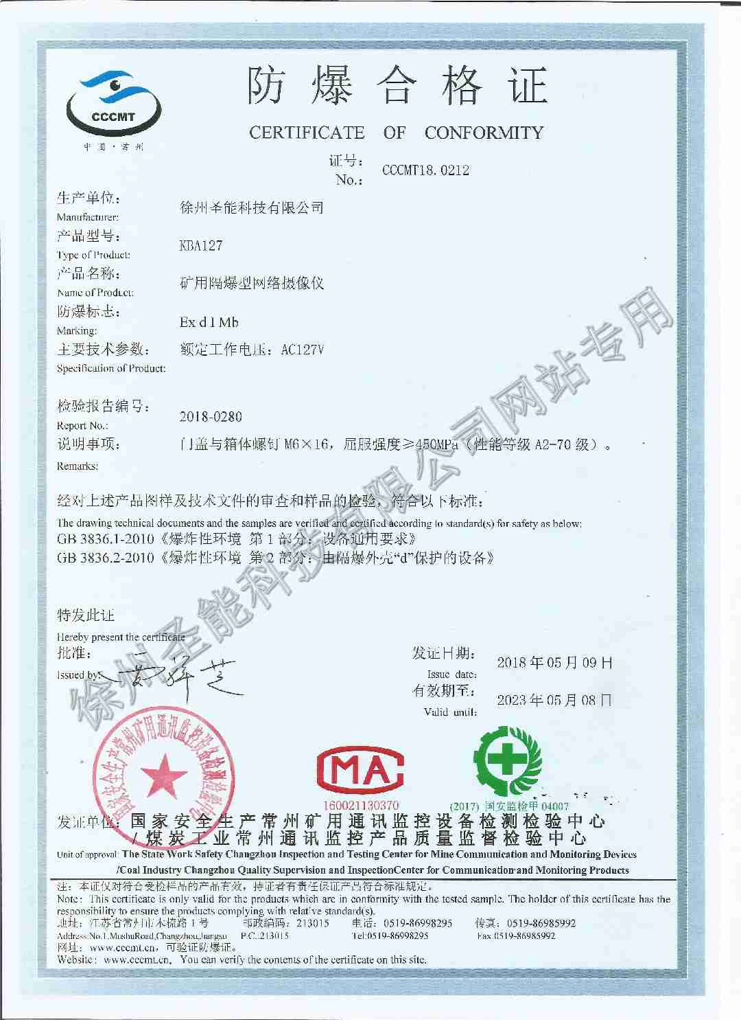 KBA127礦用隔爆型網(wǎng)絡(luò)攝像儀防爆證