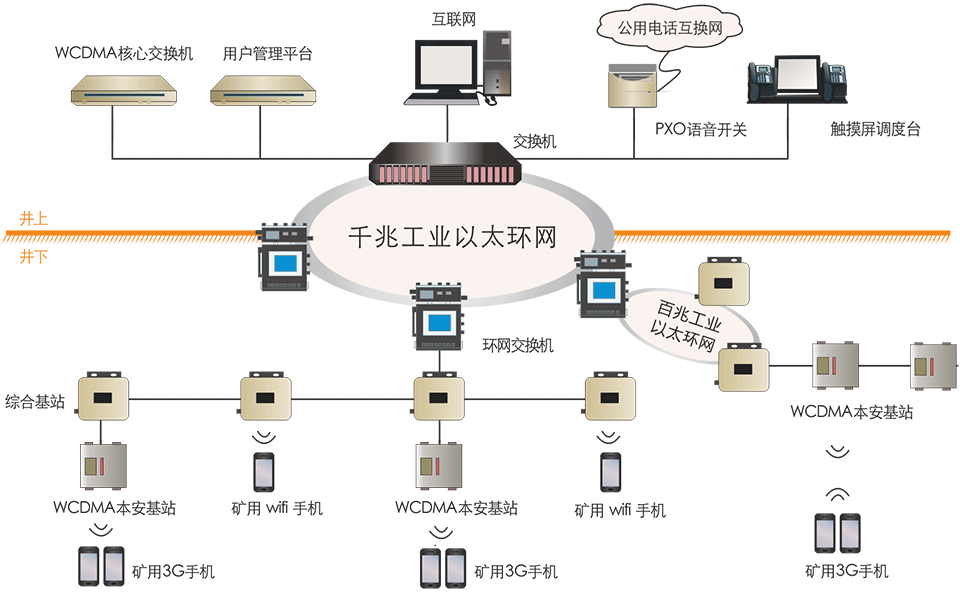 其中無線通信系統(tǒng)基于WCDMA制式,該制式是目前全球使用范圍最廣,使用人數(shù)最多、技術(shù)最成熟、速率最快的3G制式??梢蕴峁┍绕渌麅煞N3G制式更高速率的上下行數(shù)據(jù)業(yè)務(wù),為各種礦山應(yīng)用奠定了無線網(wǎng)的基礎(chǔ),徹底改變了無線通信系統(tǒng)在礦山只能打電話的歷史。